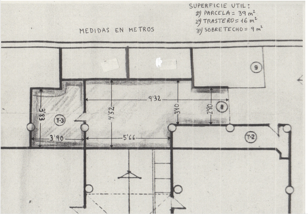 La parcela consta de 39 M2 útiles, mientras que el trastero cuenta con una superficie de 16 M2 útiles en planta, en la que se encuentran unas baldas de acero para organizar almacenamiento de herramientas y maquinaria, al que hay que sumar 9 M2 más que se encuentra en un sobre techo con baldas de acero también.